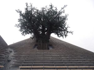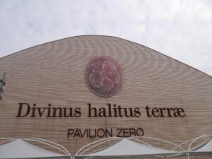 Après notre traversée curieuse auprès de ces statues, nous arrivons au pavillon zéro. Elle est inspirée de la relation de la nature, des animaux à l’Humanité. Son architecture extérieure parait très simple, de forme arrondie, constituée de lattes de bois.