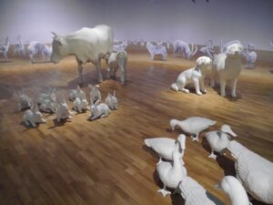 Puis on arrive à un espace où sont exposés des animaux de ferme, tous blancs et au plafond des bancs de poissons , blancs également, pour nous rappeler que les animaux sont là pour nourrir les humains.