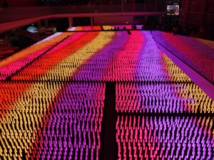 Une longue queue témoigne du succès du pavillon chinois. L’entrée nous plonge dans l’histoire de la chine avec de vieux livres , des figurines, des maquettes de paysages de rizière, des coupelles présentant divers thés, des ombrelles traditionnelles…jusqu’à s’ouvrir sur l’espace dédié à la modernité dans un contraste saisissant. Puis c’est la déambulation autour de ce parterre de lumière qui change de couleurs et de formes.