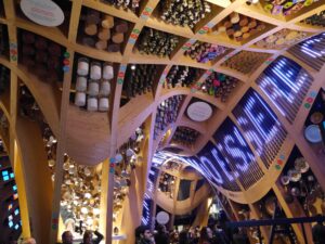 On traverse des passages où des panneaux dessinés colorés de fruits et légumes sont suspendus avant de longer un couloir composé de vitrines avec à l’intérieur des graines de toutes sortes qui symbolisent la richesse des dons de dame nature.