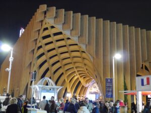 La nuit tombe quand nous nous présentons devant le pavillon français -cocorico-, il y a un monde fou là aussi. Des visiteurs rencontrés nous avaient prévenus qu’il y avait foule dans la journée sur ce pavilon, c’est pourquoi nous avons attendus la fin de la journée pour aller le voir. C’est surtout sa structure qui est incroyablement bien réalisée. elle est en bois, tout en rondeur et ondulation, renfermant des alvéoles où sont suspendus et placés d’innombrables objets liés à la cuisine et aux repas.